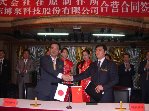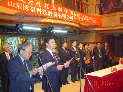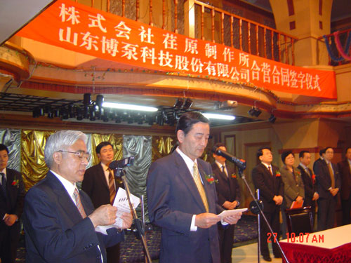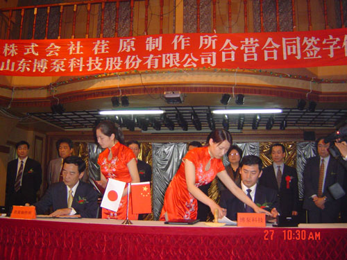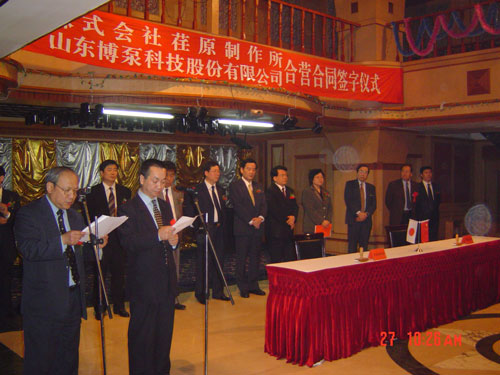 新聞中心 2005年4月27日,在博山萬杰國際大酒店山東博泵科技股份有限公司與日本株式會社荏原制作所正式簽署了注冊資本1100萬美元的合營公司――荏原博泵有限責(zé)任公司。該公司的建立將通過引進世界最大的泵企業(yè)――日本株式會社荏原制作所的先進技術(shù),加快大型泵、高壓泵國產(chǎn)化進程,建成具有國際競爭力的一流企業(yè)。為中國水電、核電及超臨界火電項目,為南水北調(diào)等大型水力工程提供高質(zhì)量、高技術(shù)含量的一流泵產(chǎn)品,提升中國機械工業(yè)技術(shù)、質(zhì)量水平,促進產(chǎn)品更新?lián)Q代,為中國電力、冶金、水力事業(yè)的發(fā)展乃至中國國民經(jīng)濟的發(fā)展做出應(yīng)有的貢獻。