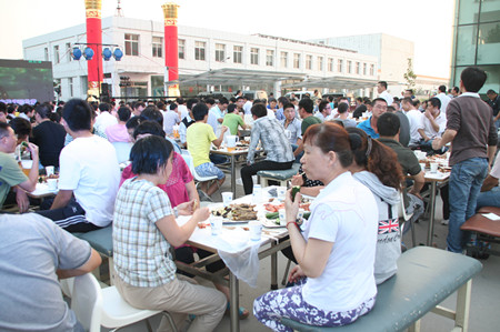 下午5點(diǎn),在夕陽的映照中,公司辦公樓前,忙碌的員工穿梭在會(huì)場(chǎng),辦公樓南面已搭建好舞臺(tái),碩大的LED屏矗立在舞臺(tái)上。舞臺(tái)兩側(cè)各豎立著兩個(gè)團(tuán)結(jié)柱。舞臺(tái)前的空地上,已擺放好63張桌子,每張桌子配放6把椅子。桌子上,豐盛的飯菜已放好,靠西邊的草坪旁,是備好的新鮮的青島扎啤。